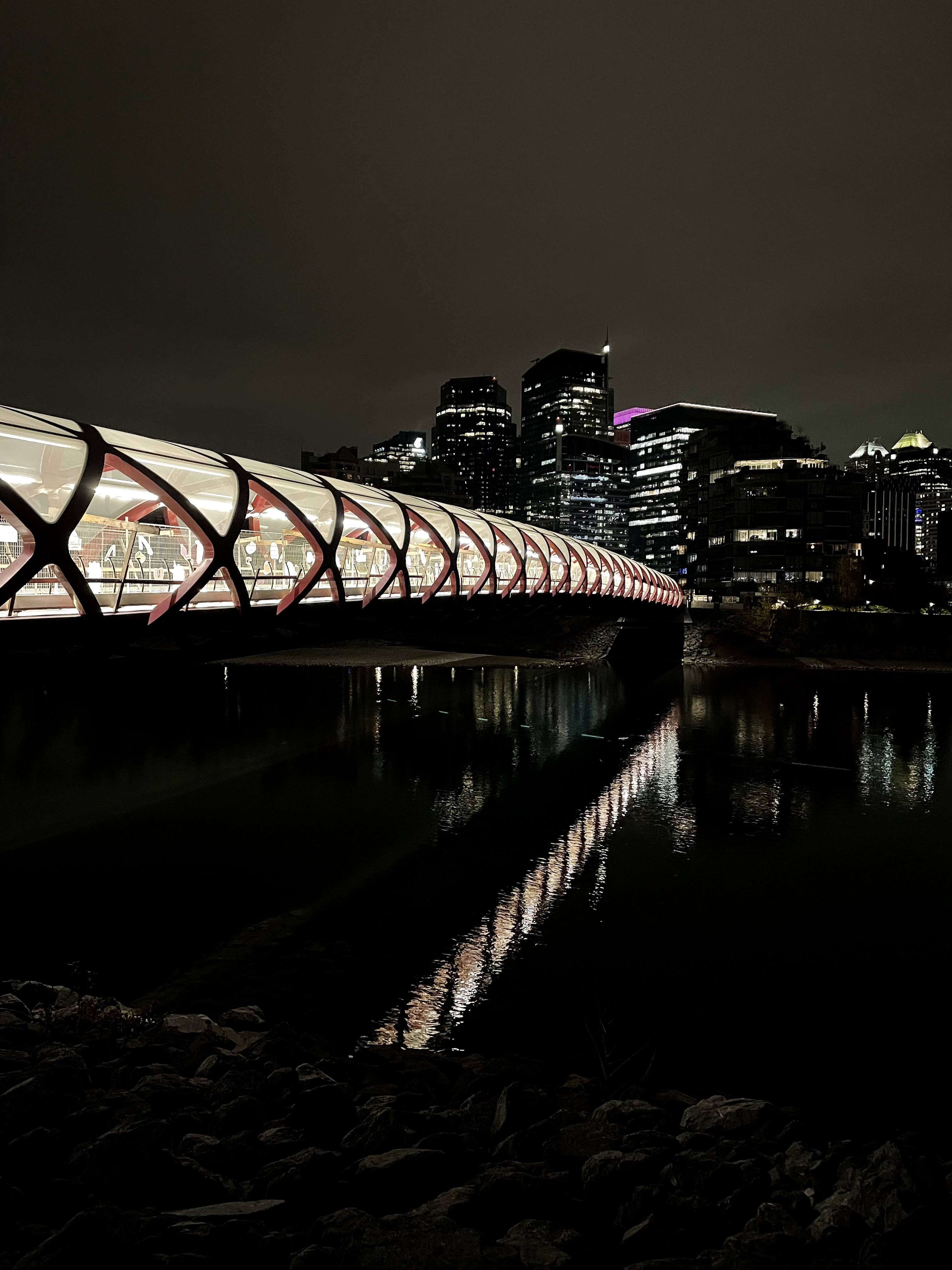 Connecting residential communities to modern urban downtown, the Peace Bridge is an iconic landmark. Its sculptural architecture provides pedestrians with protection from rain and winter weather conditions as they cross the Bow River.