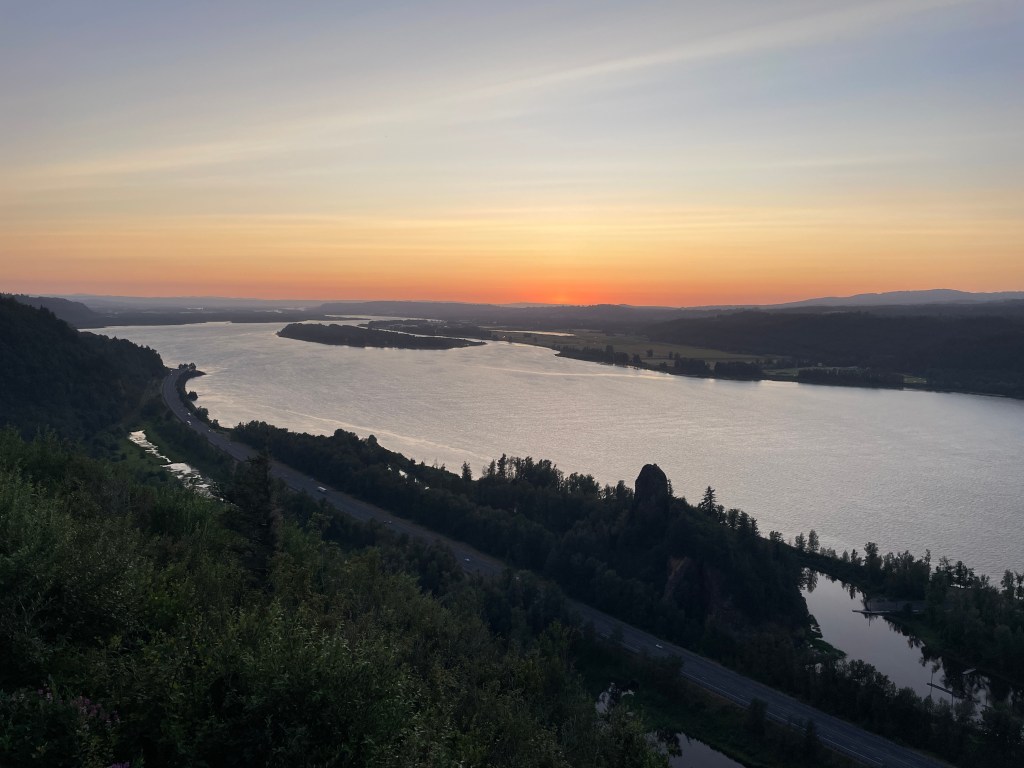 Standing atop a cliff is the Vista House at Crown Point, an ideal location to watch the sunset over the Columbia River Gorge. Enjoy the exceptionally scenic drive up 730 ft. that opens up to a panoramic view of the incandescent sky.
